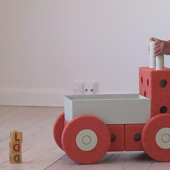 - Specifications: Contains 22 pieces (3x blocks, 14x sticks, 4x foam wheels, 1x box). At least 3 options: Walker, Wheelbarrow, Stool. Withstands max 50 kg in weight. Made for children from 0.5 - 3 years.