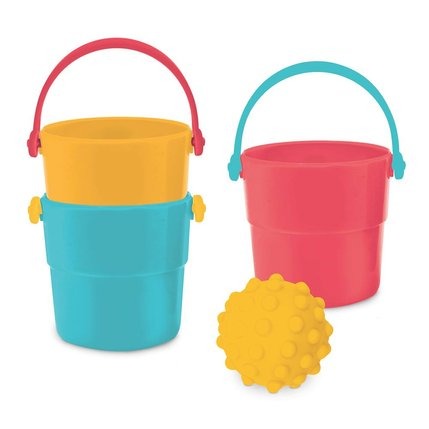 A complete kit for bath time fun! LUDI's bath cases offer a wide range of small water toys to invent wonderful adventures. Find lightweight and colorful toys of all kinds: bath books, sprinklers, small cups, a ball... There's something for everyone! The very practical case allows you to store everything in no time. Its sturdy plastic material resists small falls and guarantees perfect hygiene. Its clever rectangular shape allows you to easily slip it into a corner of the bathroom. With the help of its handle, you can easily carry it wherever you go. At the seaside or at the pool, the small water toys will follow you everywhere! Case dimensions: 27 x 12.5 x 18.5 cm. Drain the toys after use and rinse/wash with clean water regularly. Contains 3 sprinklers, 1 ball, 1 book, 1 whale and 3 buckets.