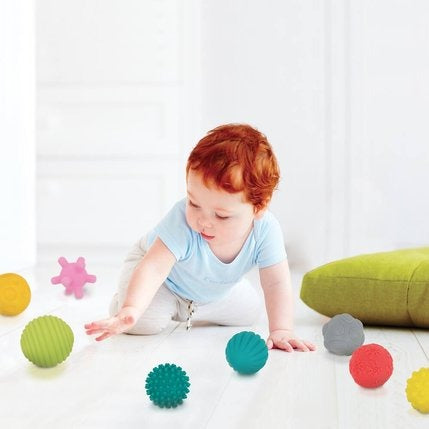 Development has never been so much fun! Sensory balls lend themselves to a multitude of games. Ribbed, smooth, or spiked, large or small, all the balls stimulate Baby's sense of touch, dexterity, and coordination of movements. Their soft, lightweight plastic material soothes baby's little teeth and guarantees perfect hygiene! Suitable for little ones from 6 months, this set of 8 sensory balls attracts baby's attention, who will be intrigued by the pretty, bright colors and numerous textures. Their small size makes them easy to hold. Create many opportunities to play, have fun, and share moments of complicity with the family! Composition 100% PVC. Washable with a damp cloth.