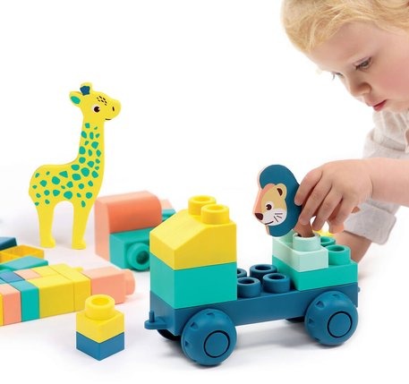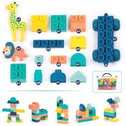 The lightweight and flexible bricks are easy for tiny hands to grasp, stack, and connect, helping to develop fine motor skills and hand-eye coordination. Your little one can build anything they can imagine, from a towering house to a fun animal train. The set even includes a sweet giraffe and a friendly lion to bring their creations to life!