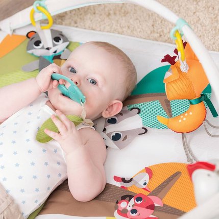 Baby awakening and activity mat. Comfortable play area, scalable usable from birth to 1 year. Theme: Forest. Equipped with adjustable, removable arches that adapt to the different stages of Baby's development. 3 Modes of use with or without the arches: Lying on your back on your stomach seated 7 Activities and games provided: 3 adjustable fabric figurines on the arches: Beaver. Raccoon. Fawn. 1 teething ring, mirror, fabrics, hide and seek game. Equipped with an arch connector and a removable touch sound and light electronic bird. Promotes the development of motor skills, visual and auditory senses, cognition and emotional intelligence.