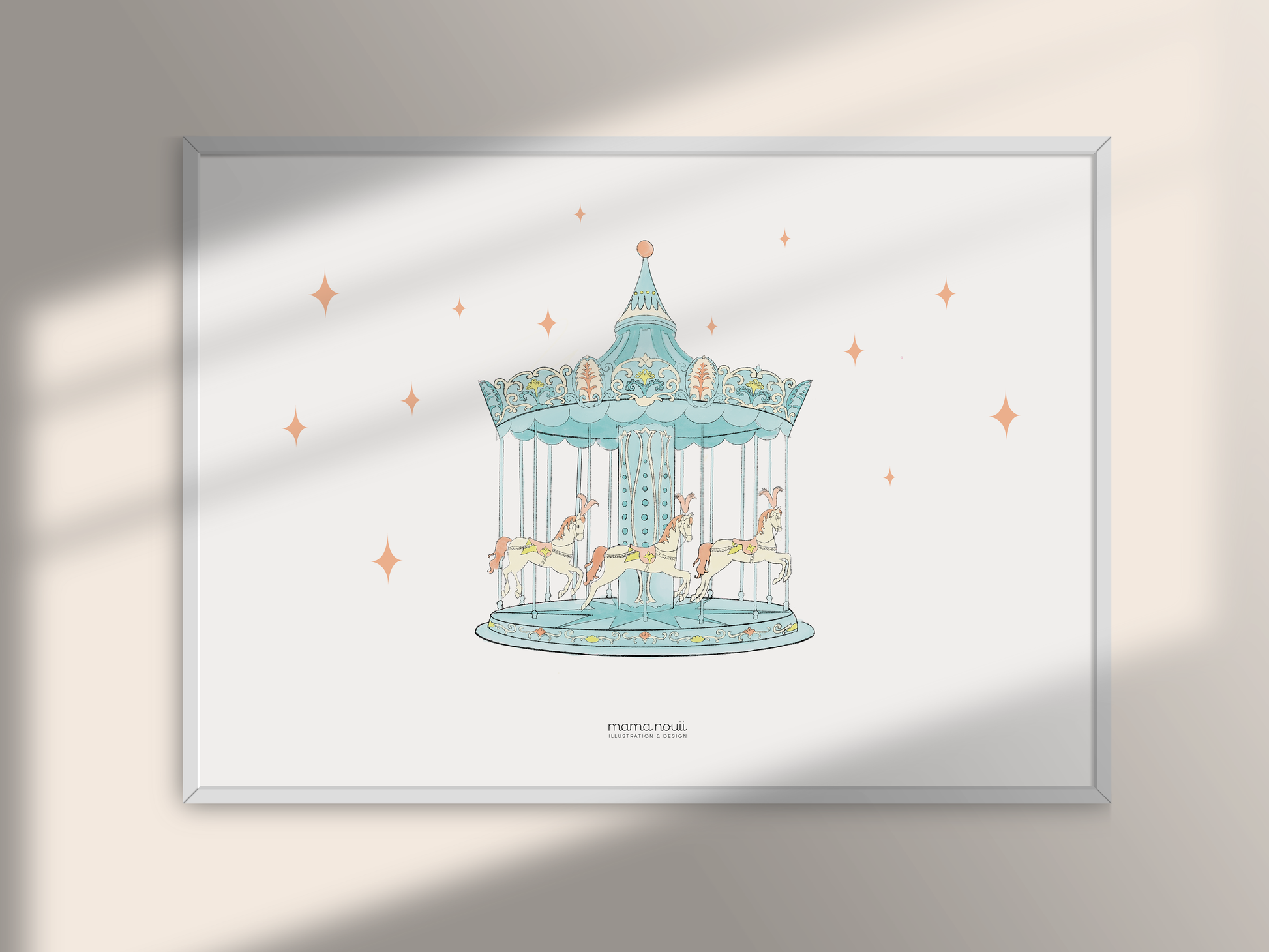 Carrousel Blue – Classic fairground fun captured in serene shades of blue for magical memories. A3. High quality print paper. As we are an eco-conscious brand, all our products are print on demand, so please allow 7 business days for order fulfillment & delivery.