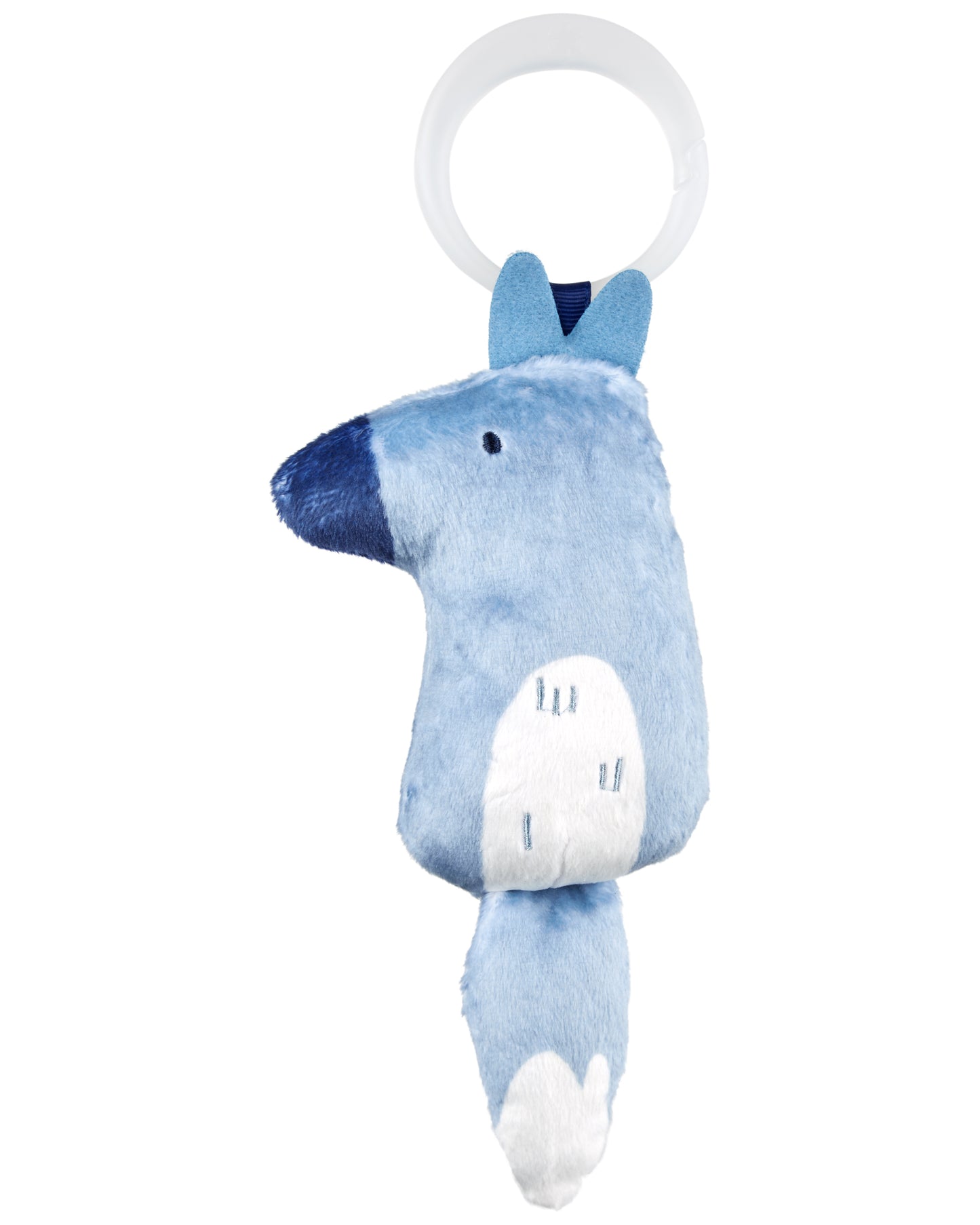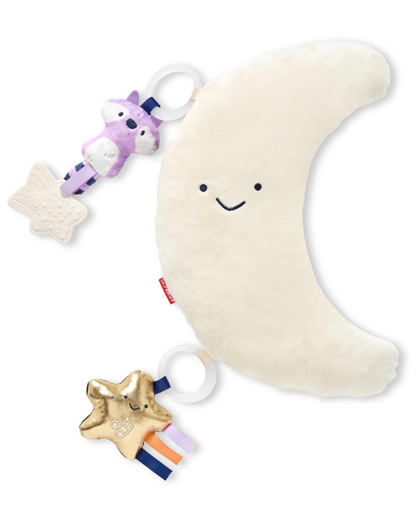 - 5 hanging toys include: Metallic musical star with tactile ribbons, Sugar glider lovey, Rattle raccoon with star teether toy, Wolf with chime, Snow owl with crinkle