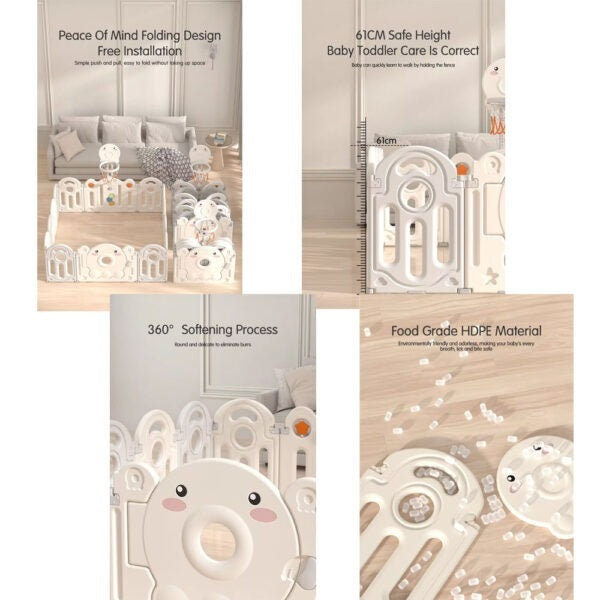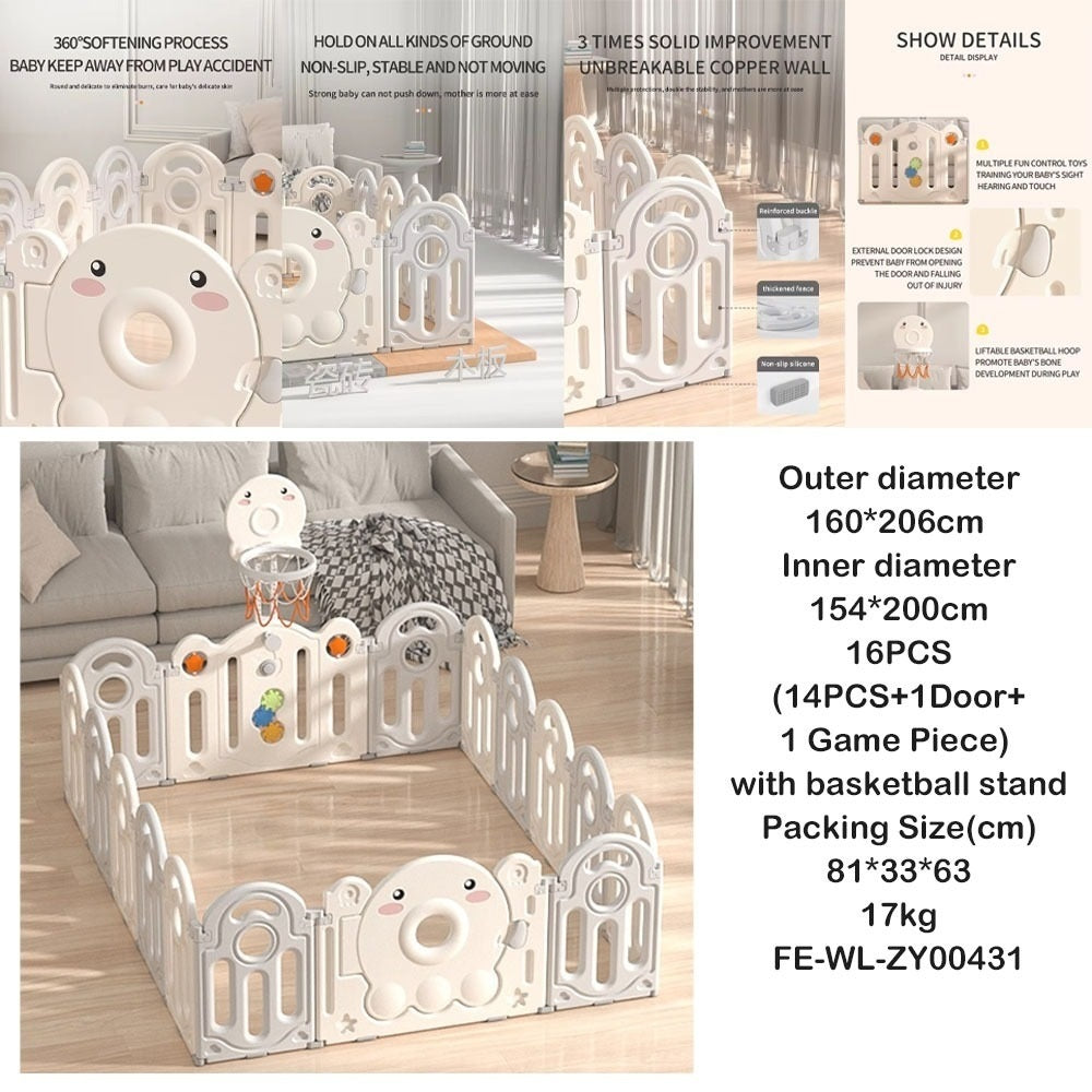 This 14-piece baby playpen offers a safe, stable, and interactive environment for infants and toddlers. It includes a variety of panels and a built-in basketball stand to promote active play, while its durable, non-slip design ensures lasting security and peace of mind.