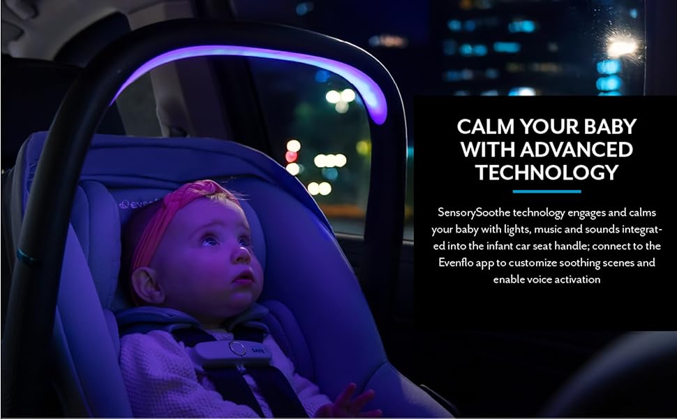 -SensorySoothe™ Technology: Built-in lights, music, and sounds in the handle calm and engage your little one. Customize soothing scenes and enable voice control with the Evenflo app.