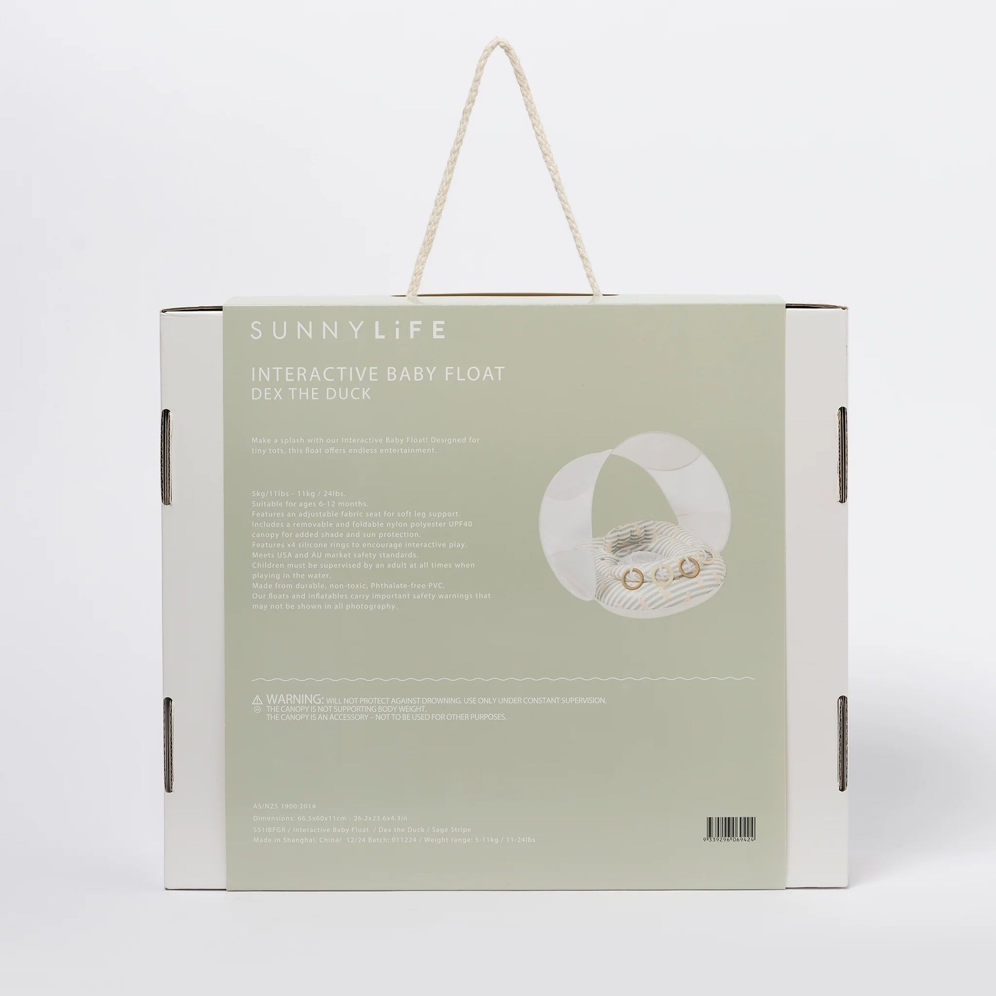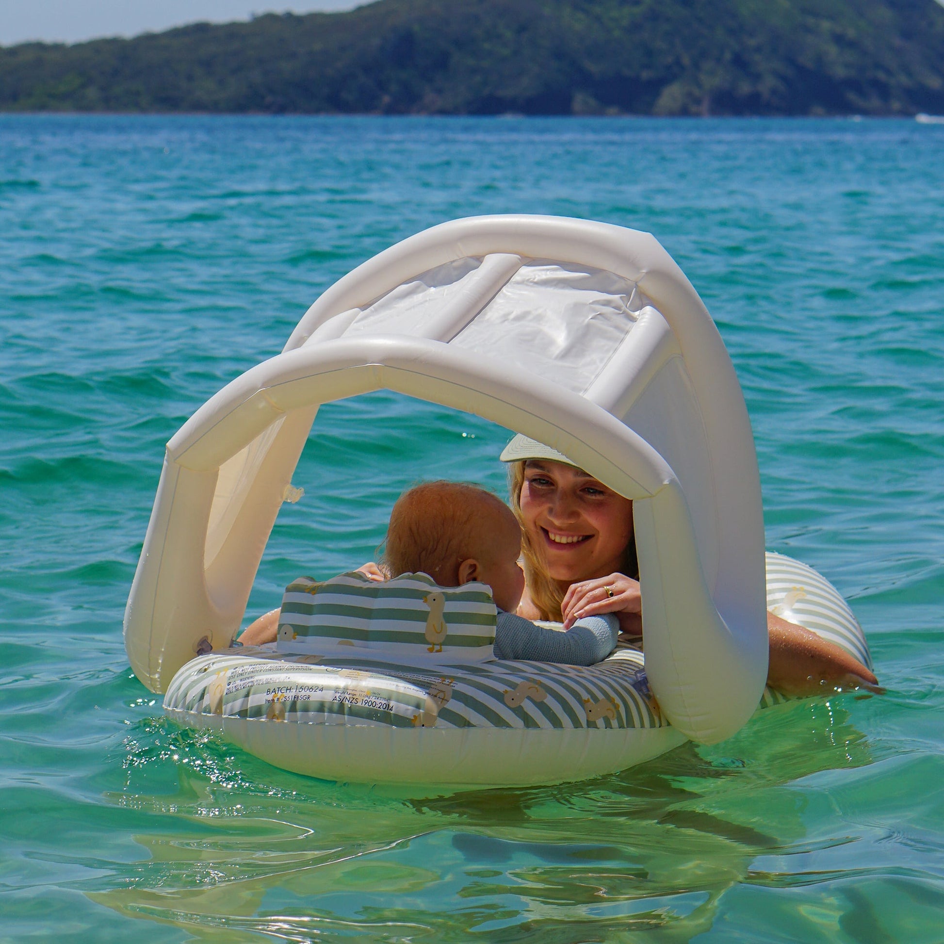 Welcome your little one to a world of calm and playful water exploration with the SUNNYLiFE Inflatable Baby Oasis! This beautifully designed float features a soothing green stripe and duckling print, complete with a protective mesh canopy and engaging toys, creating the perfect serene environment for your baby's first water experiences.