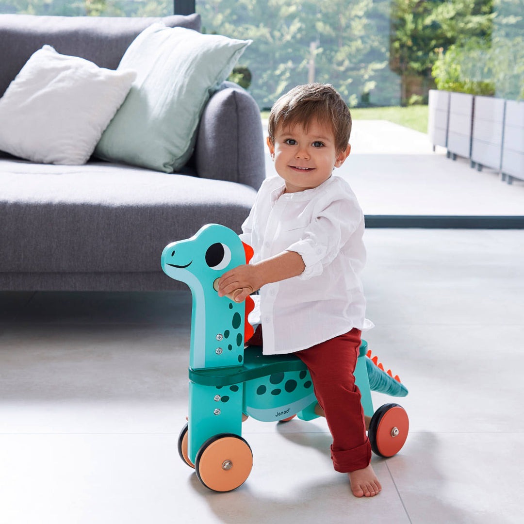 Keywords: baby ride-on toy, toddler ride-on, wooden ride-on, dinosaur toy, Janod, gross motor skills, balance toy, active play, imaginative play, first birthday gift, toddler gift.