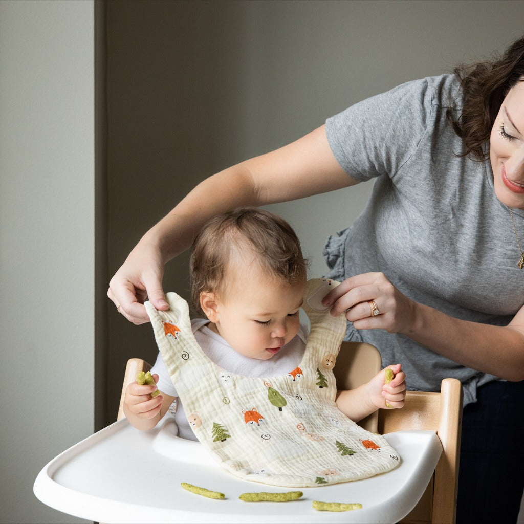 Each muslin bib features a woodland animal pattern on one side and a muted solid color on the back