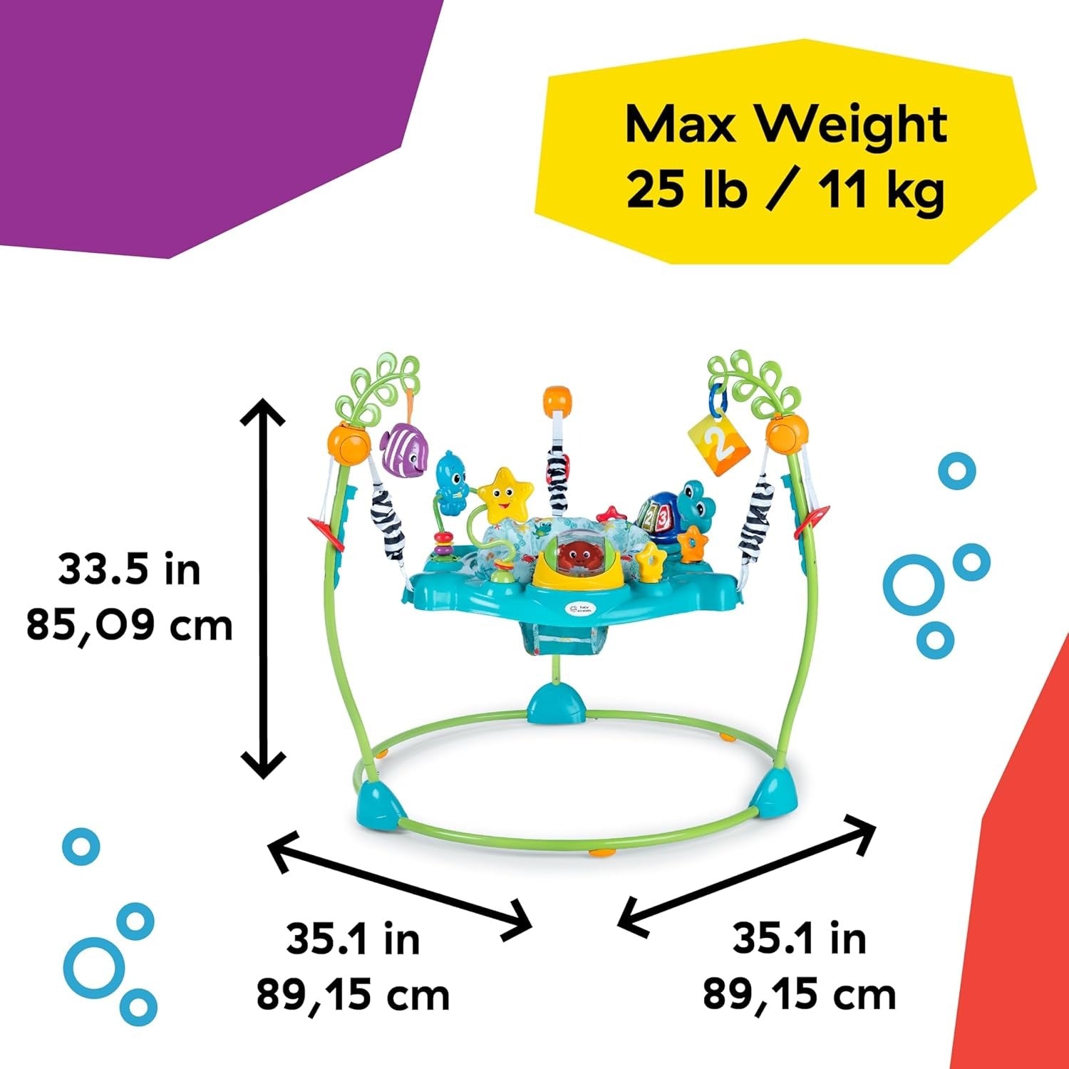 - Jumper features 4 heights that easily adjust to grow with baby; Seat rotates 360 degrees to surround baby with an ocean of learning and exploration; Dimensions: 33.5 x 35.1 x 35.1 inches