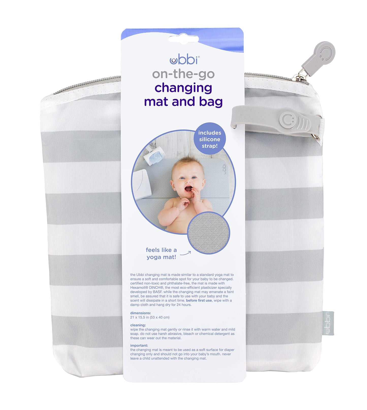 The Ubbi Changing Mat and Bag is a stylish solution that contains an easy-to-clean changing mat made similar to a standard yoga mat. It comes with an easy-to-use silicone strap that conveniently hangs on strollers and diaper bags. The changing mat bag can hold a couple of diapers, a travel-size wipes dispenser, as well as phone, keys, or whatever is needed for busy parents on-the-go.