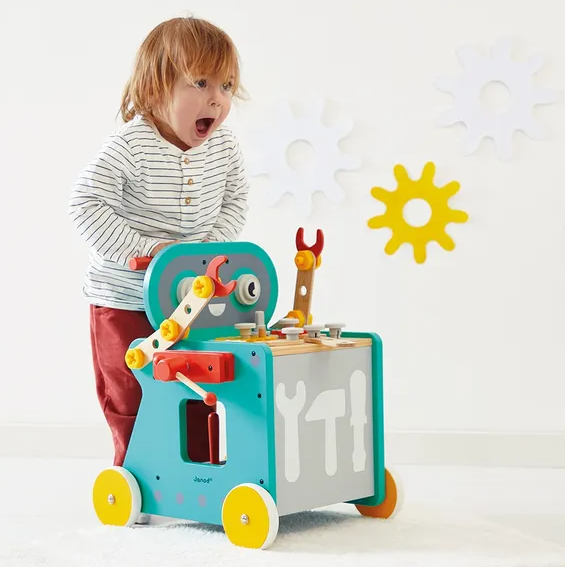 Discover the Robot Trolley from Janod 's Brico'Kids collection , a wooden toy with a DIY theme for children aged 18 months and up. Both a walker and a first DIY toy, this robot will awaken toddlers' curiosity while developing their motor skills and boundless imagination.
