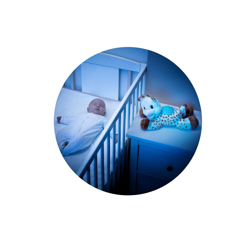 With Lighting and Lullaby Sounds. The velvety that will embrace sweets and offer him companionship at night with her very soft body. Has starburst view mode! The room is filled with colors that illuminate it and is like "one" with the sky! It also has a music and sound function! 10 melodies including sounds of nature and heartbeat that will calmly sleep your baby. The device of sound and stars is removed from Sophie so that you can easily wash it. Sound, music, and lighting are adjusted to your desire and are automatically turned off after 30 minutes.
