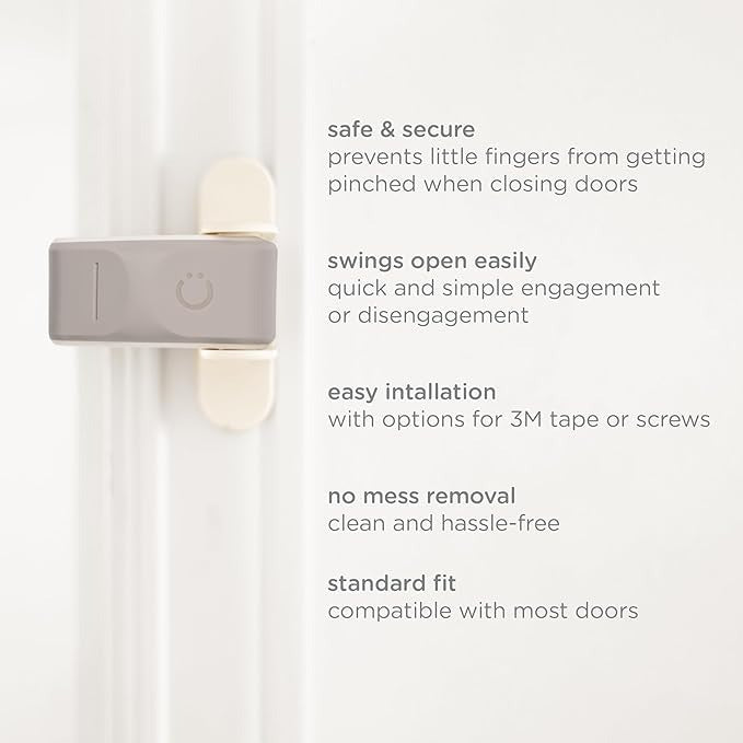 - Prevent Finger Pinches: Ubbi’s door pinch guard keeps tiny fingers safe from accidental pinches caused by closing doors. The hinged design pivots smoothly, preventing doors from slamming shut while allowing adults to easily open and close doors when needed.
