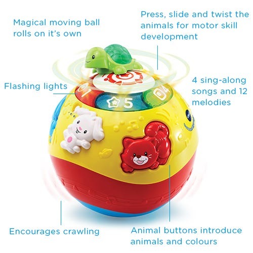 Catch the ball if you can! The Crawl & Learn Bright Lights Ball by Vtech features a fun built-in motor that activates to magically move the ball promoting crawling. The transparent colourful number buttons light up attracting baby and the spinning disk on top spins the cute turtle triggering fun responses. Press the chunky buttons to meet the dog, cat, bear and rabbit, learn numbers 1-5 and hear 4 songs sung by the animals and listen to 12 happy melodies. English speaking voice promotes recognition and accelerates learning.